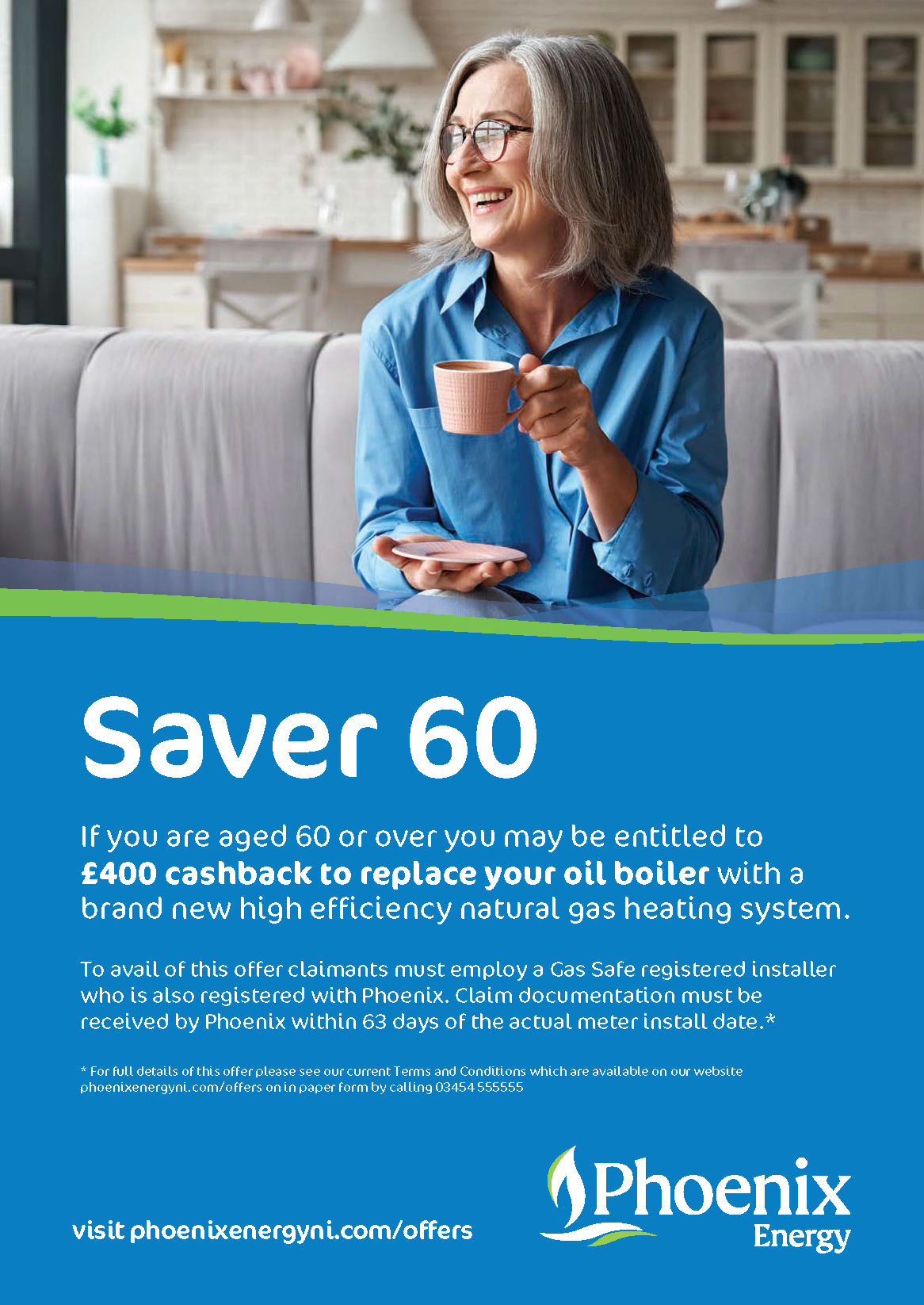 If you are 60 or over you may be entitled to a £400 cashback to replace your oil boiler with a brand new high efficiency natural gas heating system.